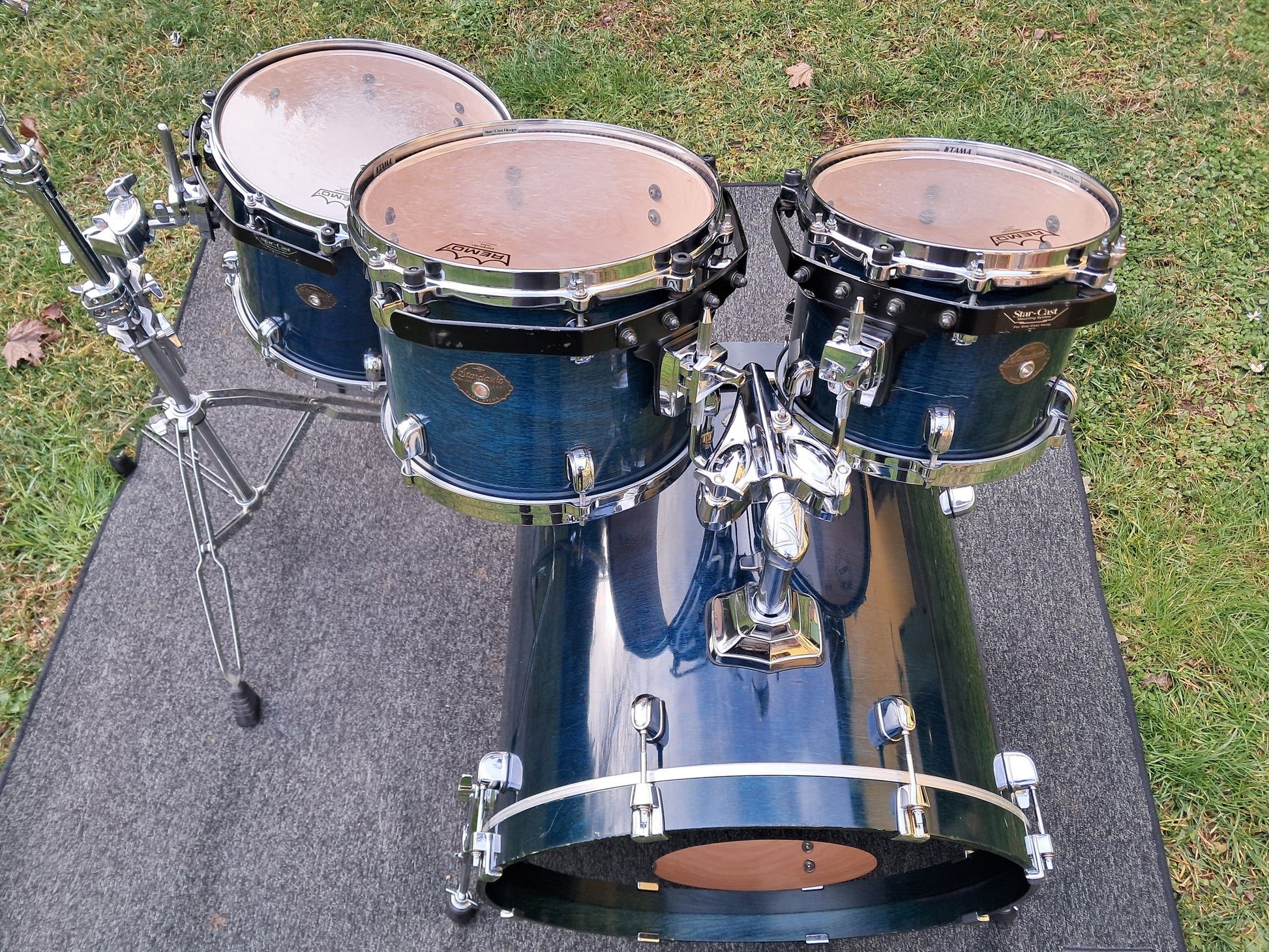 Set di fusti Tama Starclassic Performer, configurazione 10"x8", 12"x9", floor tom sospeso 14"x11", cassa 22"x18". Fusti interamente in betulla non forati (a parte la cassa), per un suono definito, brillante e controllato, ideale in contesto live e studio. Finitura Blu scuro con venature a vista, elegante e distintiva, cerchi die-cast e sistema di sospensione Star-Cast. Condizioni buone ma non perfette, la batteria è stata usata in diversi contesti live e presenta diversi segni, ovviamente si tratta di difetti estetici sulla finitura più che veri e propri danni. In compenso le pelli (remo emperor clear su tom/timpano e powerstroke 3 su cassa) sono in condizioni quasi perfette.