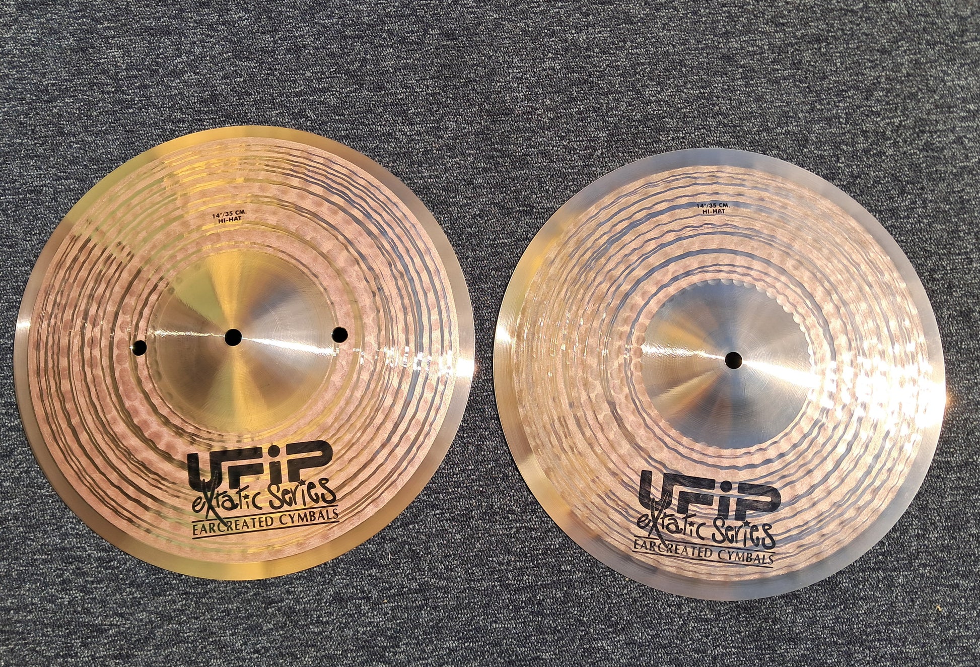 UFIP Extatic Hi-Hat 14", nuovi ex demo, mai usati; peso top 990g / bottom 1300g. Suono brillante, moderno ma con un tocco vintage, ottimo mix di definizione e musicalità. Hi-hat estremamente versatile, perfetto per funk, pop, fusion e rock. Nessun segno d'usura, mai usati live. Vera occasione per chi cerca qualità UFIP a prezzo ribassato.
