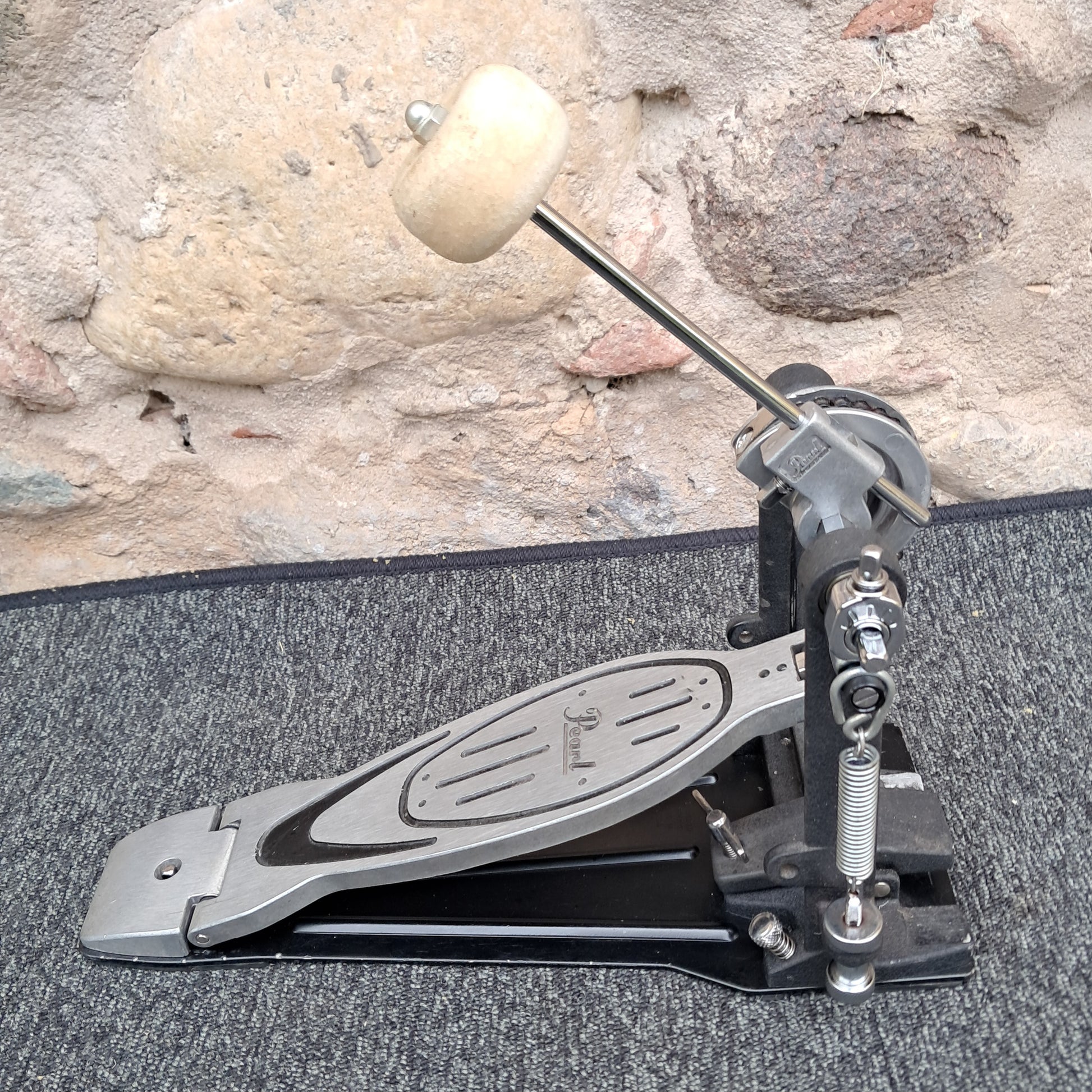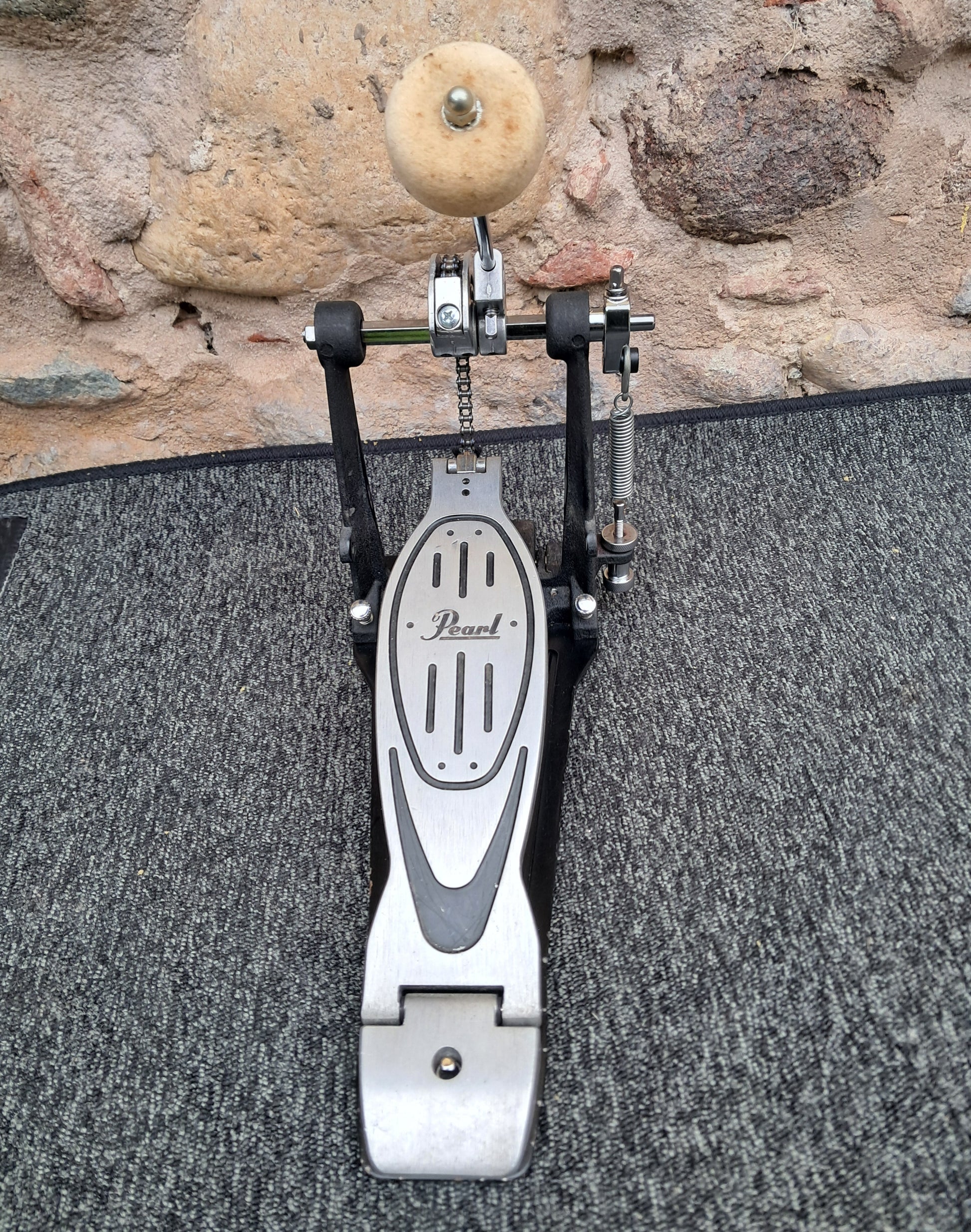 Pedale Pearl P900, in buone condizioni, trazione a catena singola e piastra d'appoggio in acciaio, battente non originale.