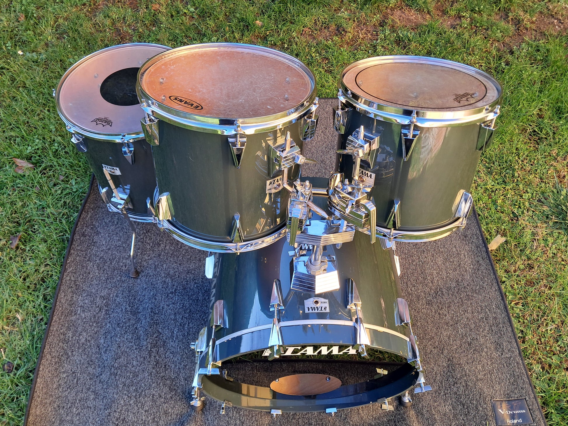 Batteria made in Japan durante i primi anni 80, fusti in 9 strati di betulla, le misure sono: cassa 22x16, tom da 12x11 e 13x12, timpano a terra da 16x16. In condizioni ottime, veramente molto ben tenuta nonostante i quaranta e passa anni di età! All'epoca era il set di livello professionale della cassa giapponese e ancora oggi la si può considerare tra i set meglio riusciti in assoluto.